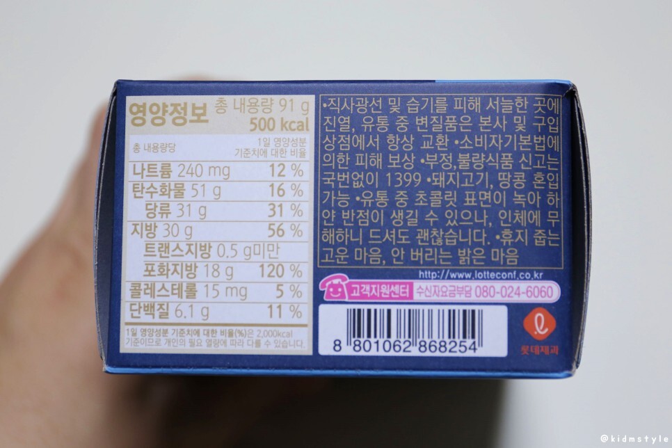 초콜릿 가공품 91g에 500kcal로 앞에 소개한 제품보다 10kcal가 적다.