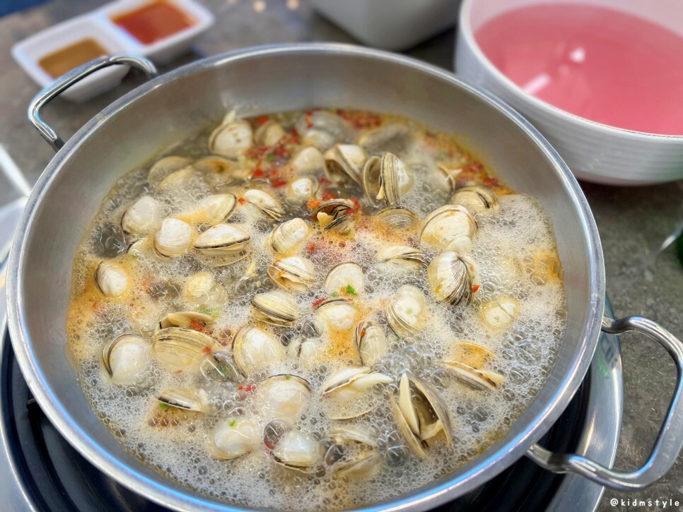 팔팔 끓는 모습이 아주 잘 나타나는 사진이다. 조개들이 입을 하나씩 벌리기 시작한다.