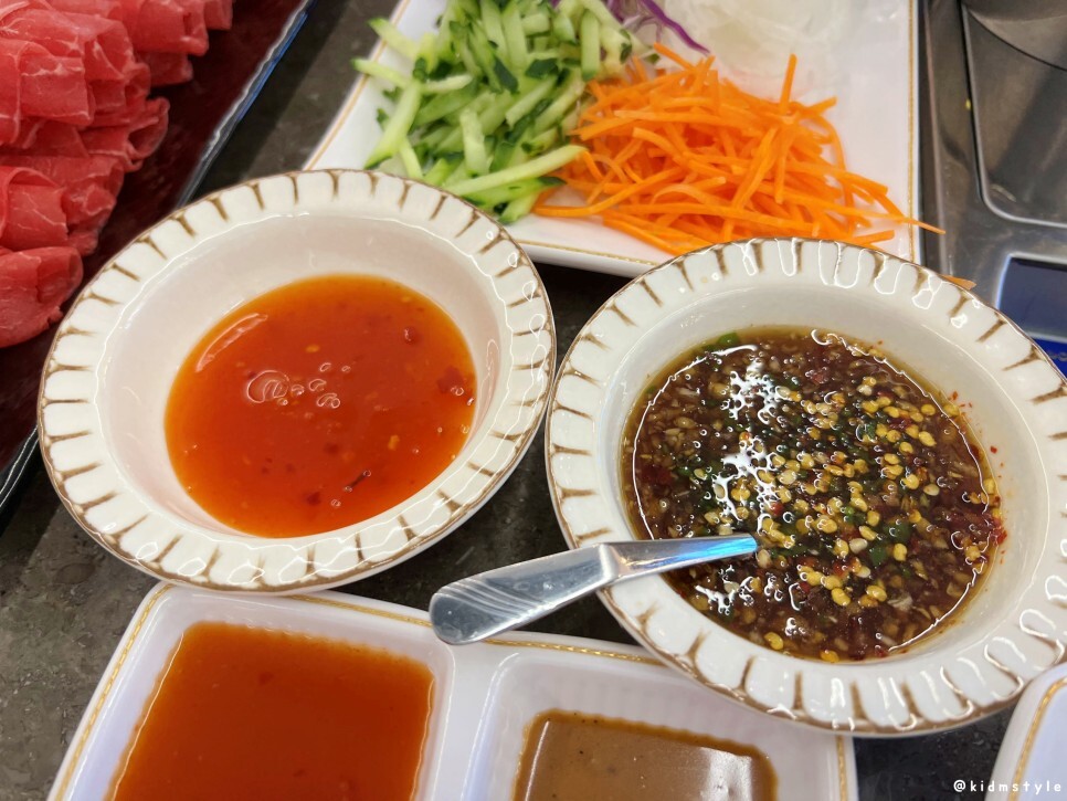 소스가 별미이다. 매운 칠리소스와 매운 간장소스인데 매운 간장소스가 정말 맛있다. 계속 손이 간다. 네모난 종지에는 칠리소스와 땅콩소스도 있다.