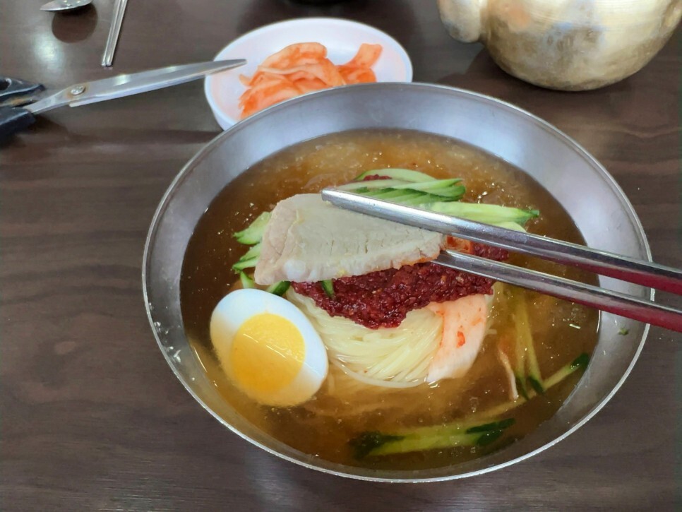 좋아하는 오이와 강렬한 색깔의 양념이 눈길을 사로잡는다. 이 양념은 보기보다 자극적이지 않다. 온육수에서 이미 맛을 느꼈지만 양념을 풀기 전에 국물을 살짝 맛본다. 역시나 끝 맛에서 한약재의 맛이 잠깐 지나간다. 아주 약하게 올라온다는 얘기다. 국물은 새콤달콤 맛이 좋고 맛이 괜찮다. 내 입맛에는 약간 아쉬운 느낌이라고 적어두고 싶다. 맛이 없는 게 아니라 개인의 입맛 차이 정도라고 얘기하고 싶다.