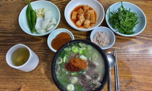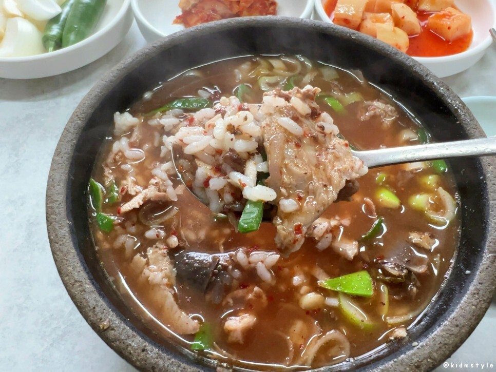 순대국밥 좋아한다면 이 국물이 상당히 반가울 것이다. 이 집 국밥의 육수는 돼지고기, 순대, 돼지사골 등을 함께 우려내는데 순대 선지의 영향으로 국물이 시커먼 게 특징이다.