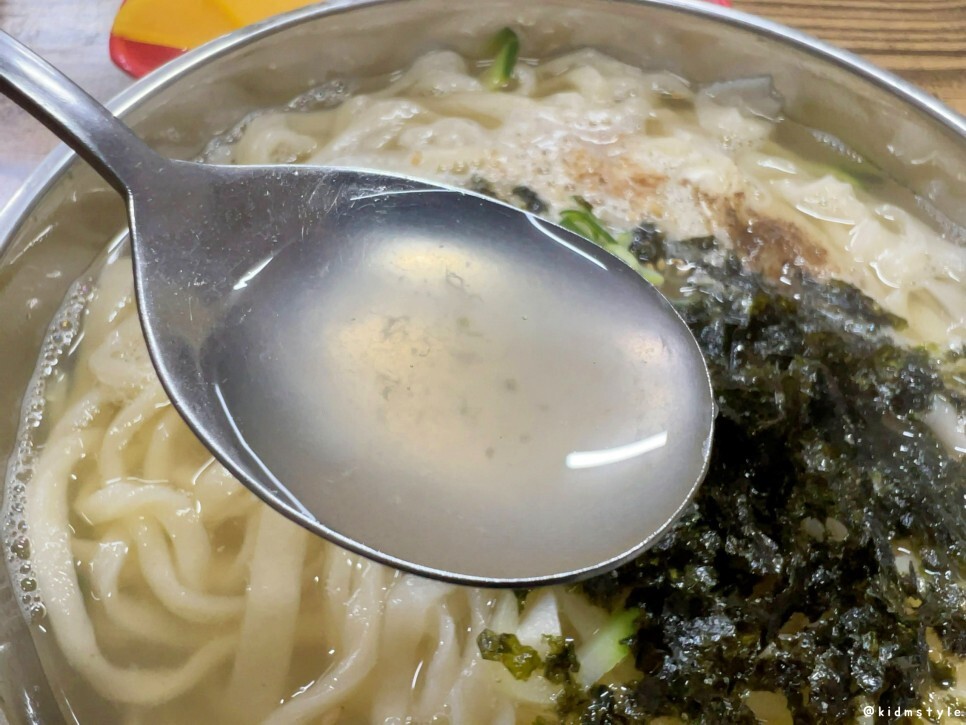 다대기를 피해 국물부터 살짝 떠서 맛을 보자. 앞서 남해 멸치 상자를 보았듯이 멸치 베이스의 육수이다. 맑은 국물이며 깔끔하다.