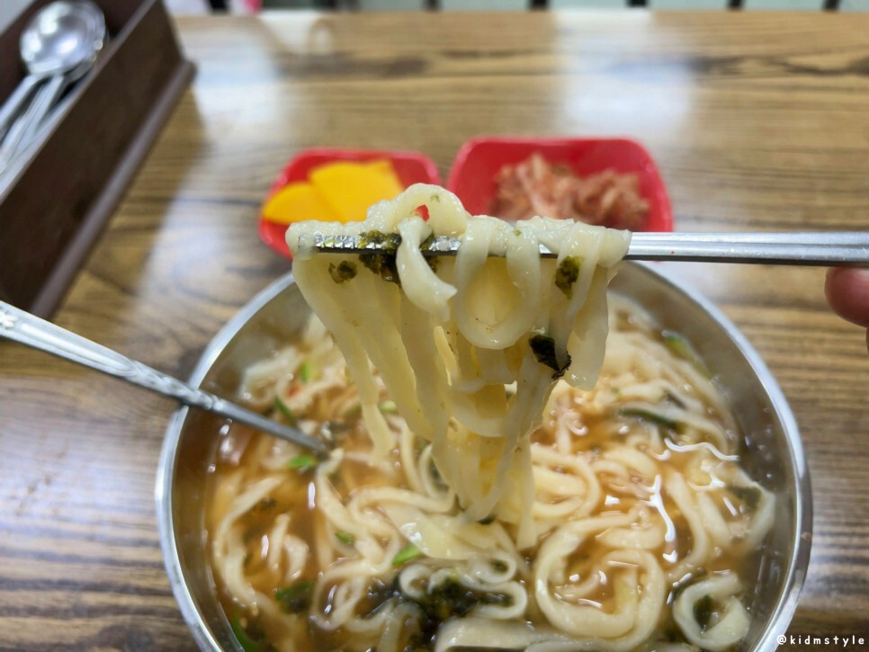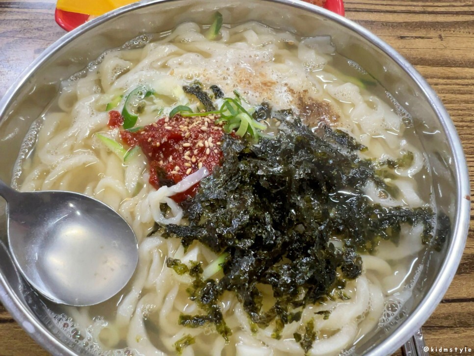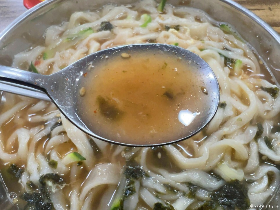 첫인상이 의아했는데 이후에 계속 맛보니 생각이 달라지더라. 희한한 게 맛볼수록 매력적인 칼국수이다. 이 집 칼국수의 매력을 오롯이 느끼고 싶다면 다대기를 덜어내지 말고 꼭 그대로 저어서 맛보는 것을 추천한다. 국물이 조금 탁해지는데 이 부분이 포인트가 된다.
