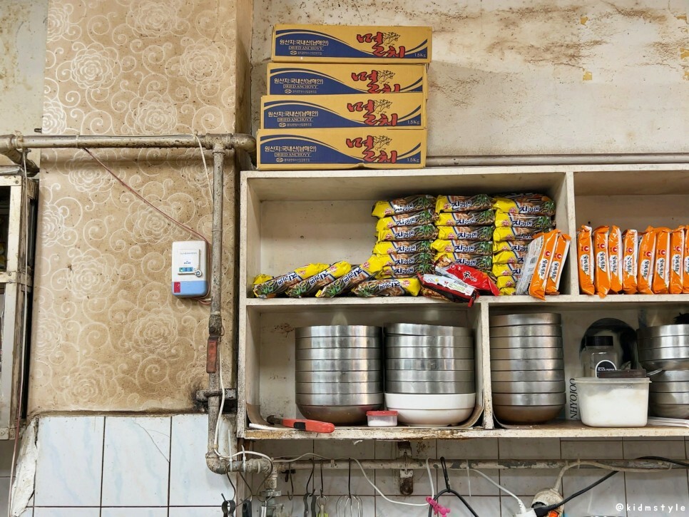 국산 남해 멸치를 사용해서 육수를 내는 모양이다. 늘 가게 앞에 오토바이나 자전거 위에 멸치를 말리는 모습을 만날 수가 있다.
