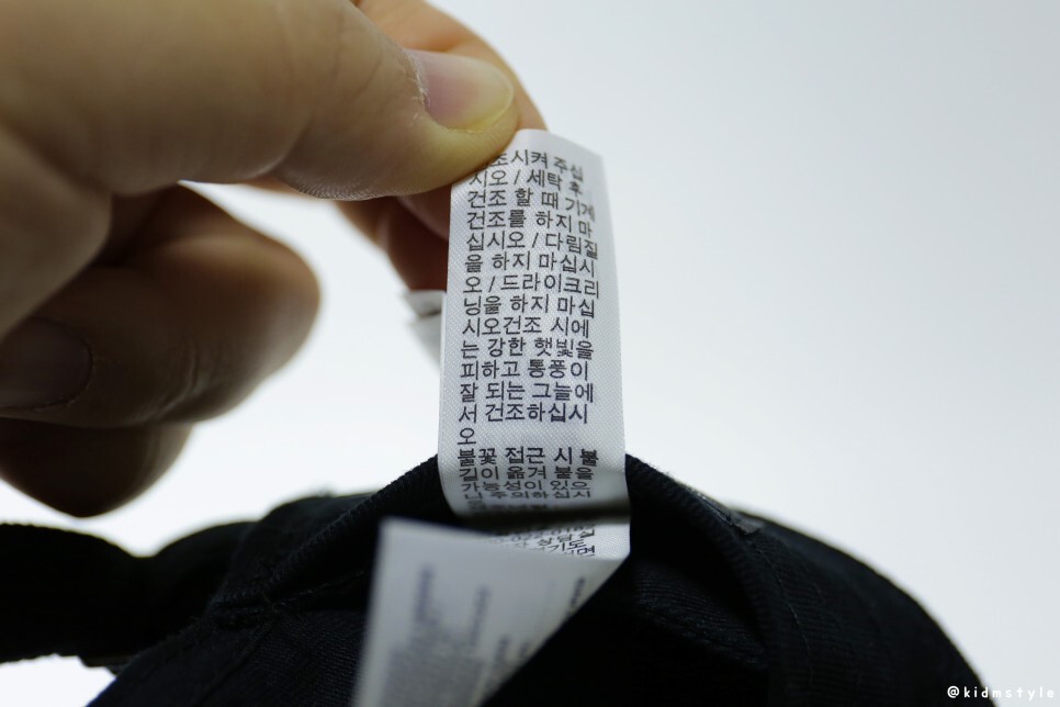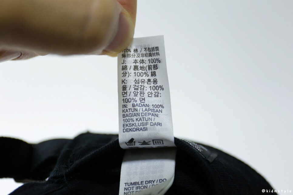 세탁 방법이 적혀 있다. 해당 모자의 블랙 색상은 물이 잘 빠진다는 후기가 많기 때문에 세탁에 신경을 써야 한다.