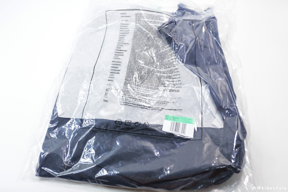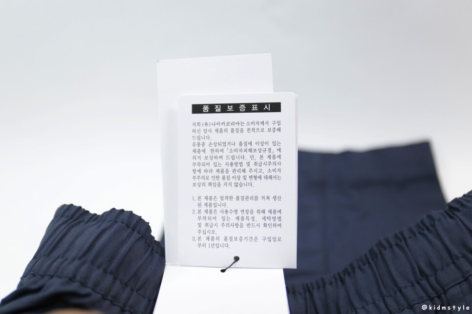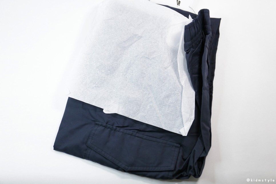 비닐 포장을 벗기면 바지가 나오는데 얇은 종이가 올라가 있다. 옷감을 보호하는 종이다.