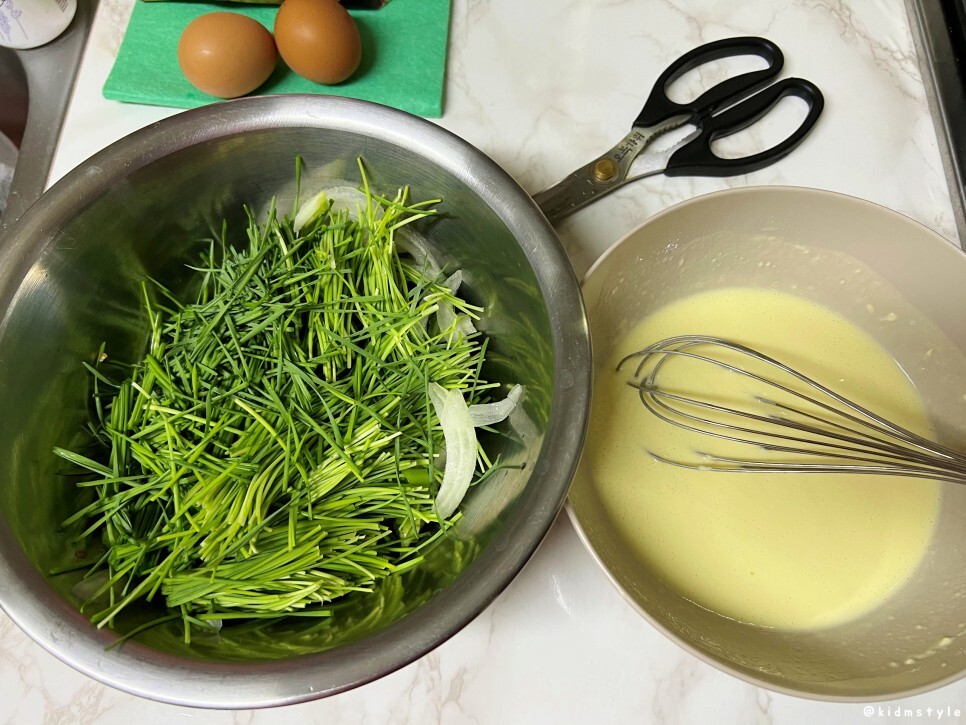 부침가루를 적당히 물에 풀고 달걀도 2알 준비하고 본격적으로 만들기 시작한다.