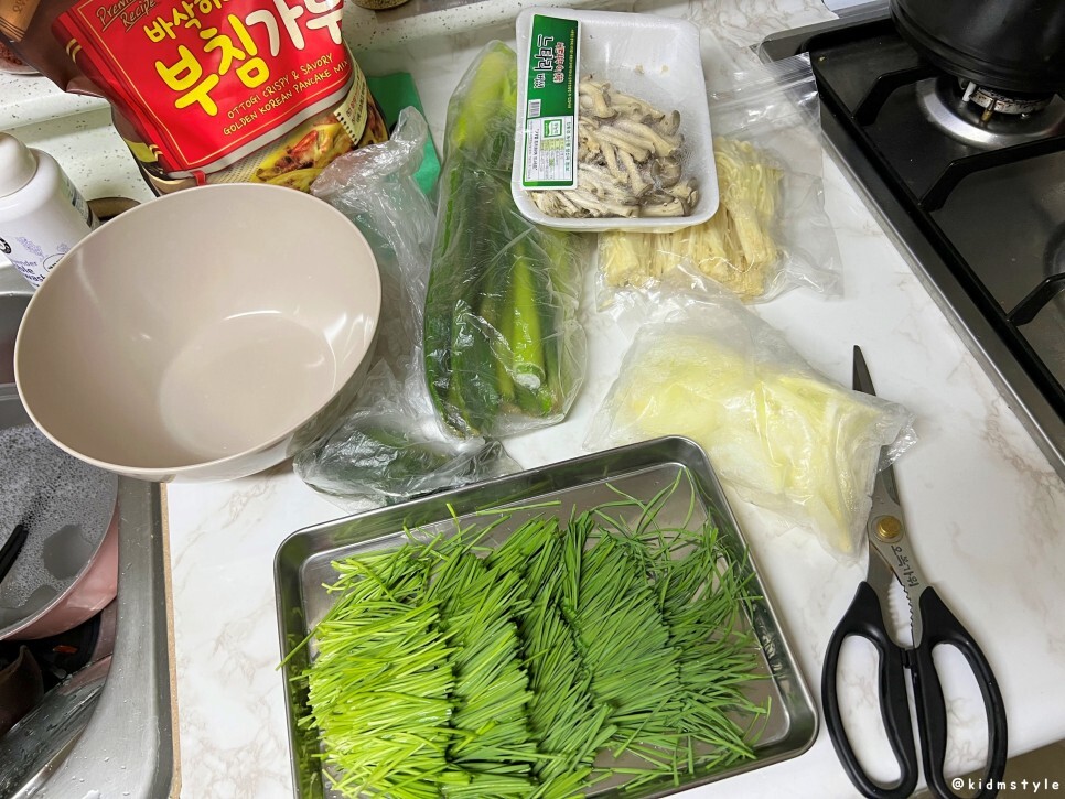 집에 오자마자 냉장고에서 재료를 주섬주섬 꺼낸다. 영양부추 2팩을 사서 한 팩은 다른 요리를 해먹고 남은 한 팩은 부추전을 위해 적당한 크기로 잘랐다. 일반 부추보다 가늘고 덜 질겨서 부드러운 영양부추인데 취향에 맞게 잘게 잘랐다. 대파, 느타리버섯, 팽이버섯, 땡초, 양파까지 이 정도면 충분하다.