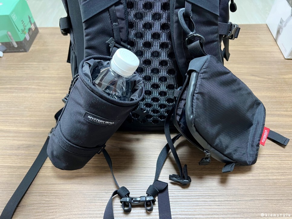 배낭 한쪽에는 미스테리월 보틀 캐리어를 장착하고 다른 한쪽에는 듀라팩 durapack 보조 파우치를 장착해서 스마트폰 등을 수납한다. 산행 시 이동하면서 사진 촬영, 지도 확인 등 스마트폰 조작이 필수라서 파우치가 상당히 유용하다.