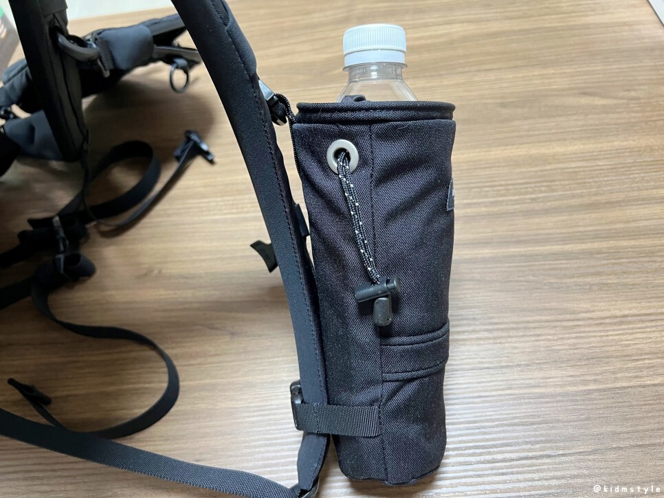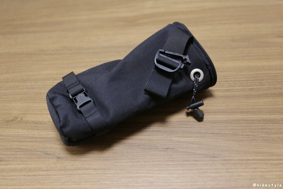 제품의 길이는 21cm이며 무게는 54g이다. 무겁지 않다. 위아래 2개의 고정 장치 버클이 있어서 배낭에 고정하고 사용하면 된다. 물통을 수납하고 옆에 달린 조임끈을 이용해서 고정하면 격한 활동에도 물통이 빠지지 않는다.