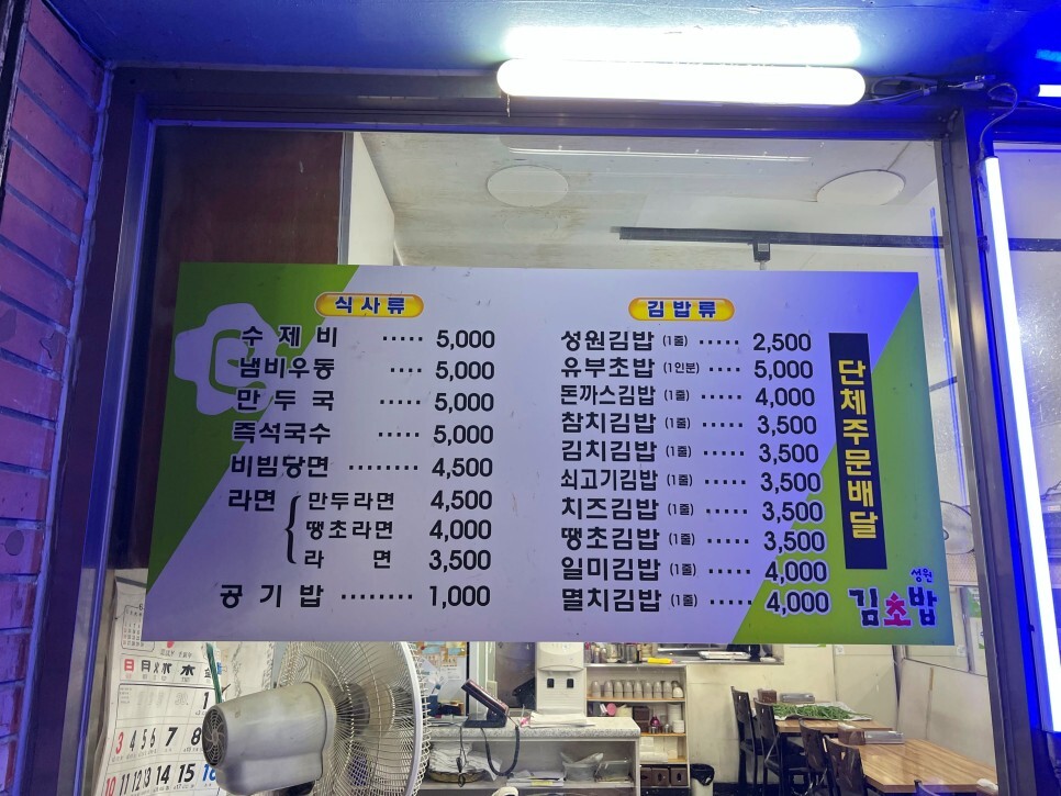 메뉴판을 찍어보았습니다. 김밥, 유부초밥, 라면 등 분식을 위주로 하는데 김밥 종류가 정말 많죠? 오랜 기간 다니면서 종류별로 맛봤는데 맛있습니다. 재료 취향껏 주문하시면 될 것 같네요. 저는 가장 기본 김밥인 성원김밥을 주로 먹는답니다. 포장을 해서 맛보는 편인데 오래간만에 식당에서 먹어봅니다.