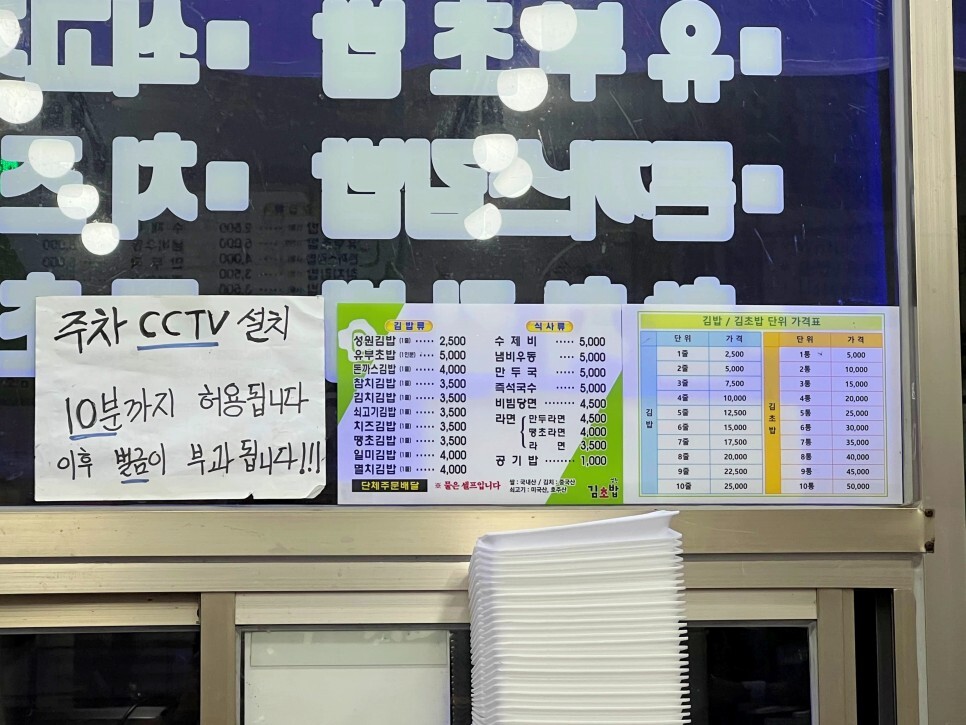 주문해놓고 잠깐 김밥을 찾을 경우 잠시 주차는 허용되지만 식사를 하신다면 식당 앞 노상 공영주차장에 주차하시면 됩니다.