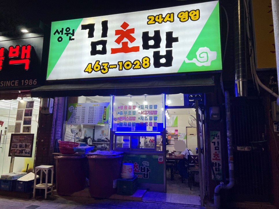 늦은 밤에도 여전히 간판에 불이 들어와 있는 성원김초밥입니다. 김밥이 생각날 때 성원김초밥에서 라면과 함께 맛보시는 건 어떨까요?