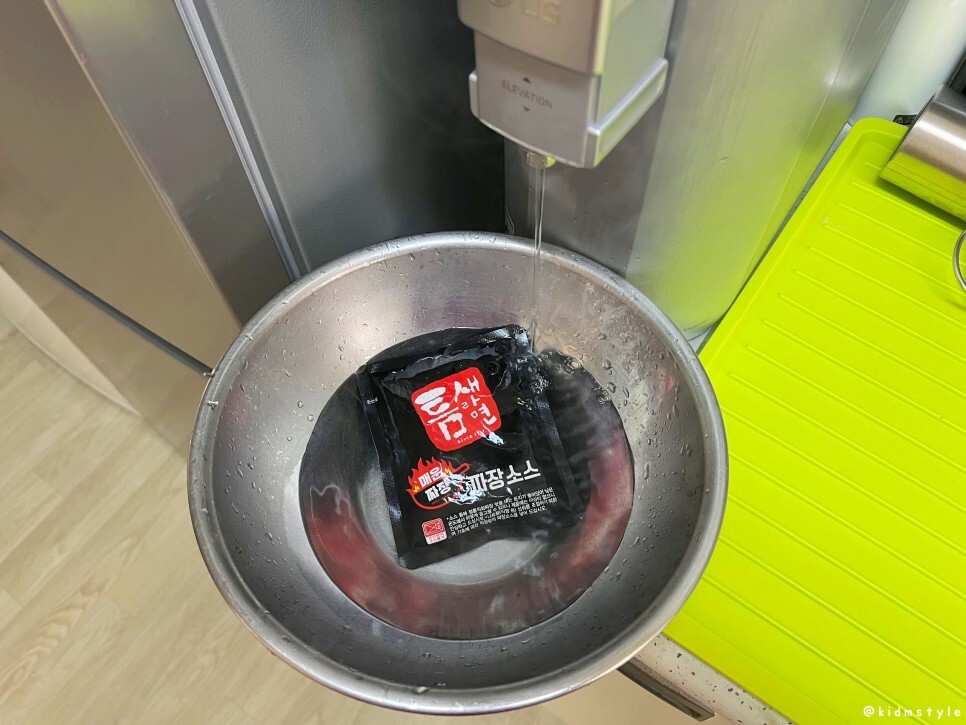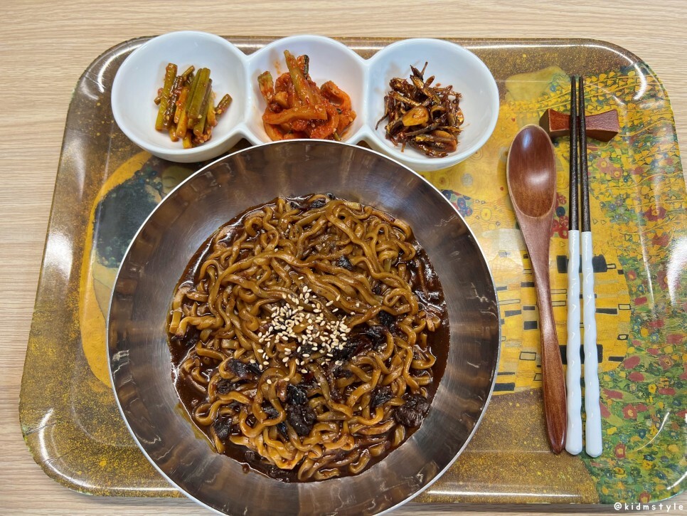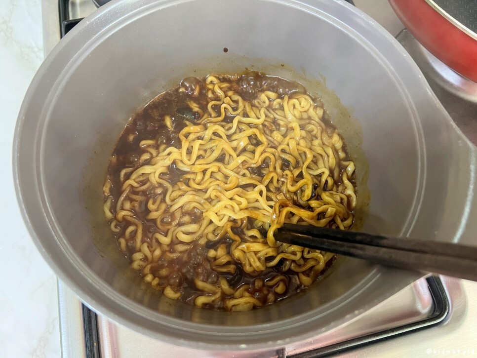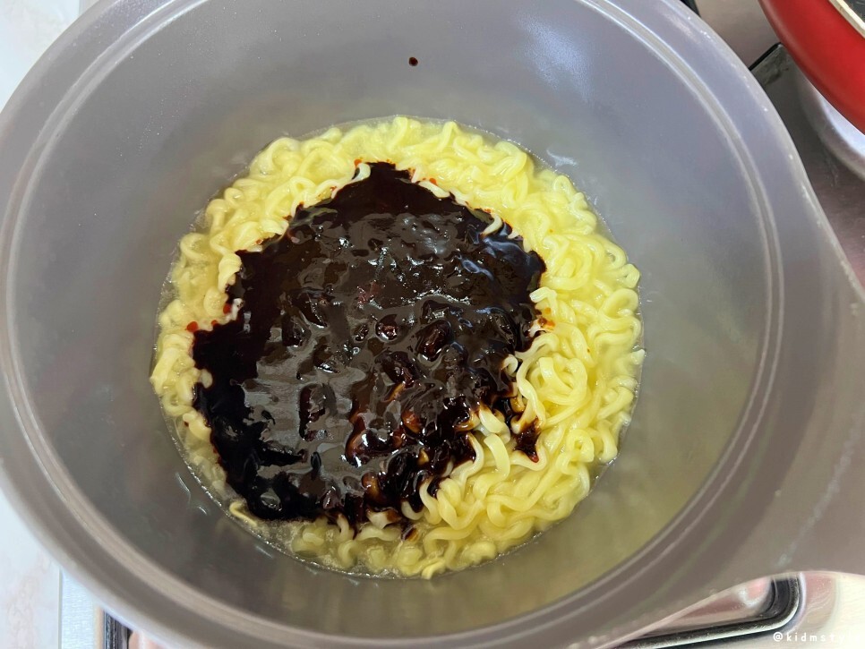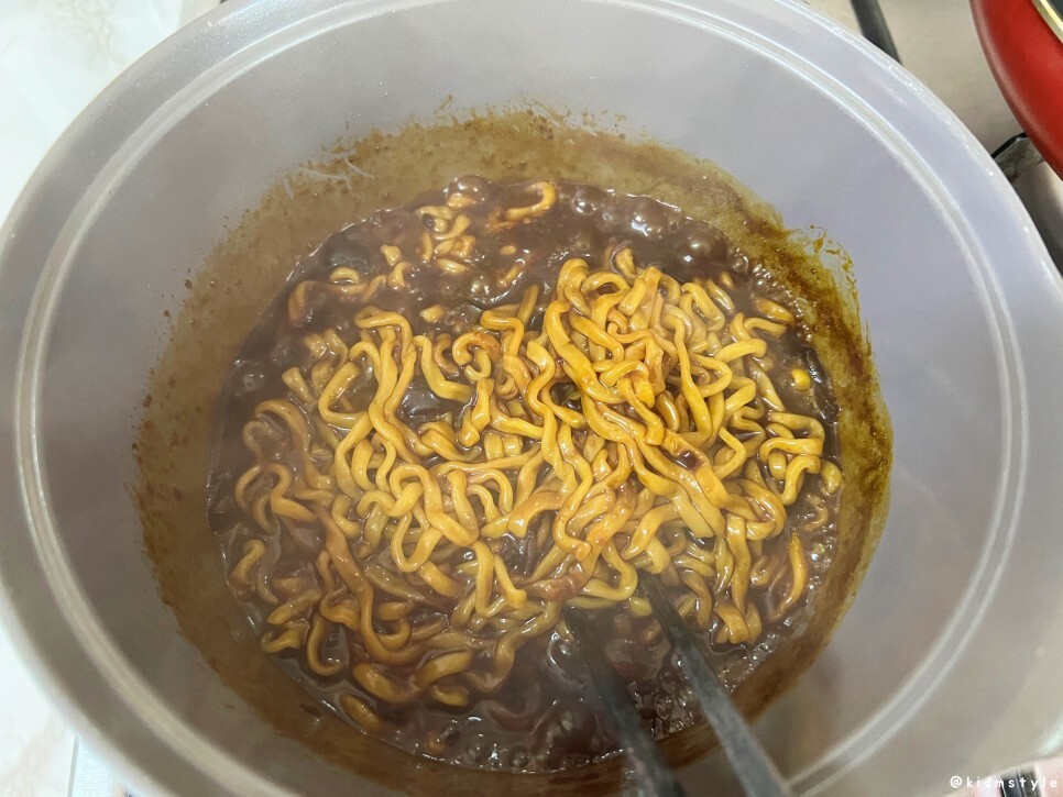 면은 다 끓인 다음 물을 버리고 따뜻한 물로 데워놓은 짜장 소스를 열어보았다.