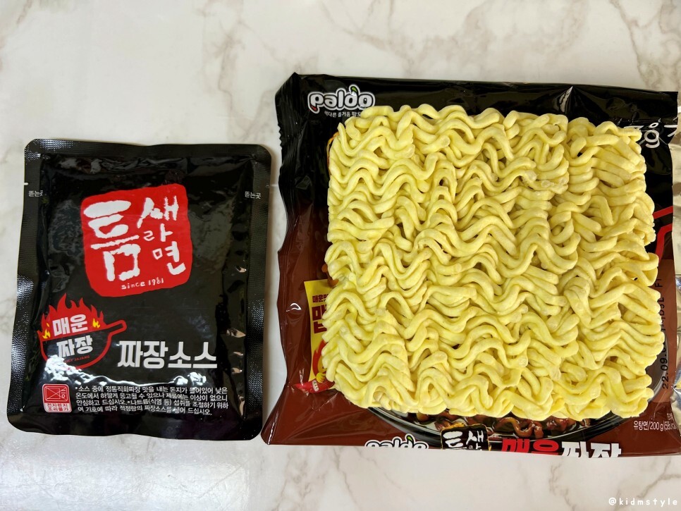 매운 짜장 소스와 면의 구성이다. 면발은 기존의 틈새라면보다는 굵은 느낌이다.