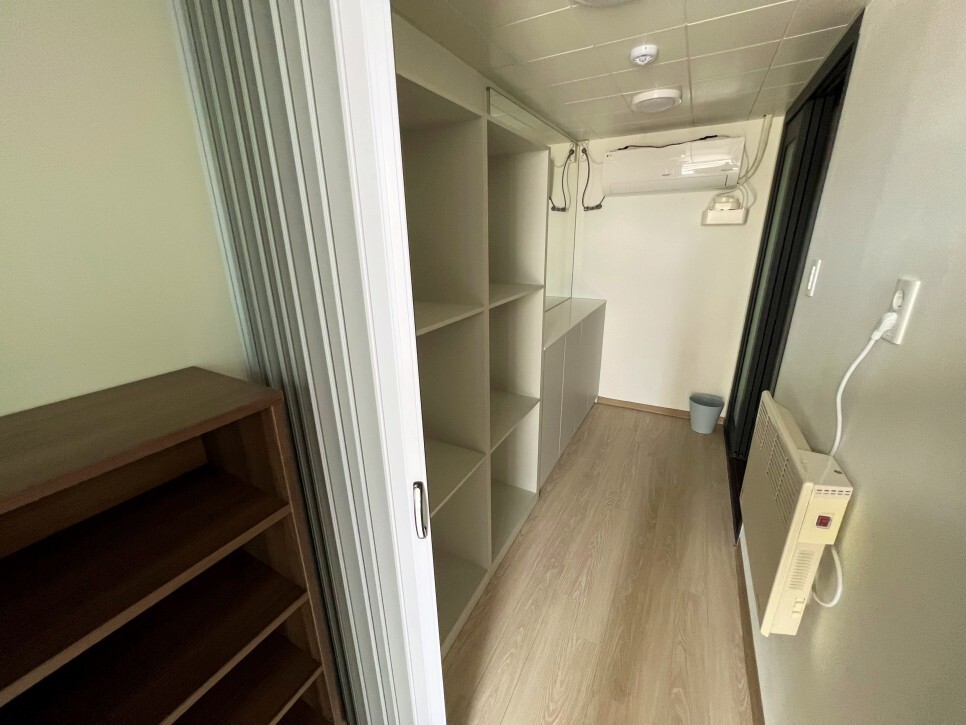 샤워장 내부의 모습입니다. 신발장과 안쪽 옷장, 거울 등이 있고 에어컨도 있네요. 좋습니다.