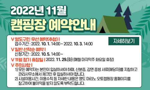 사설이 아닌 부산광역시 영도구에서 운영하는 캠핑장이기에 더 기대가 됩니다. 주말은 예약이 힘들 것 같고 저는 평일에 시간을 내서 한번 예약하고 방문해 볼 생각입니다. 캠핑장 예약은 한 달 전에, 영도 구민은 우선 예약으로 매월 1일부터 3일, 일반은 매월 5일에 예약이 열린다니 한번 노려봐야겠습니다.