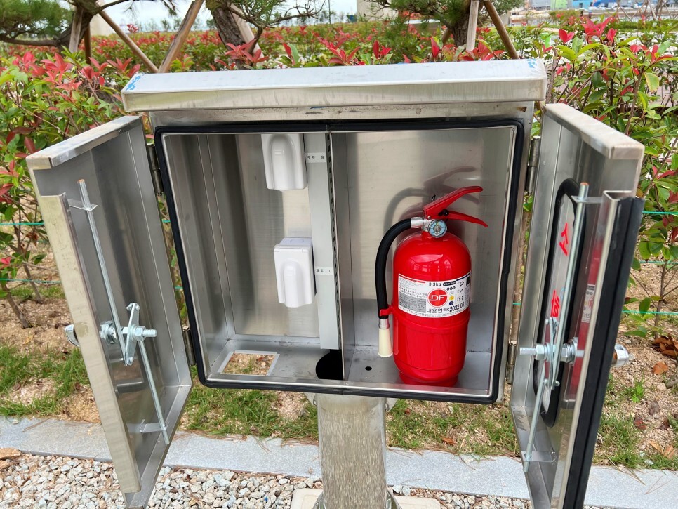 각 사이트에는 배전반이 놓여 있습니다. 220v 콘센트 2개와 소화기도 하나씩 비치되어 있네요. 릴선은 그리 긴 것이 필요 없어 보이네요. 30m 이상은 필요 없고 10m 정도도 충분해 보입니다.