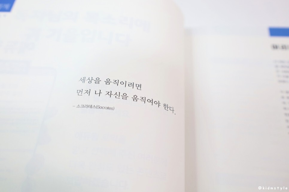 첫 장을 펼치니 소크라테스의 명언이 눈에 들어온다. '세상을 움직이려면 먼저 나 자신을 움직여야 한다.' 아주 공감하는 말이다. 머리로 생각만 하면 뭐 하나? 움직이면서 실천을 해야지. 거기다가 타인의 조언이 빛나면 본인의 고집도 조금 꺾을 수 있는 유연함도 장착하면 최고다. 나이가 들수록 그 유연함이 줄어들어서 힘들어하는 경우를 많이 본다.