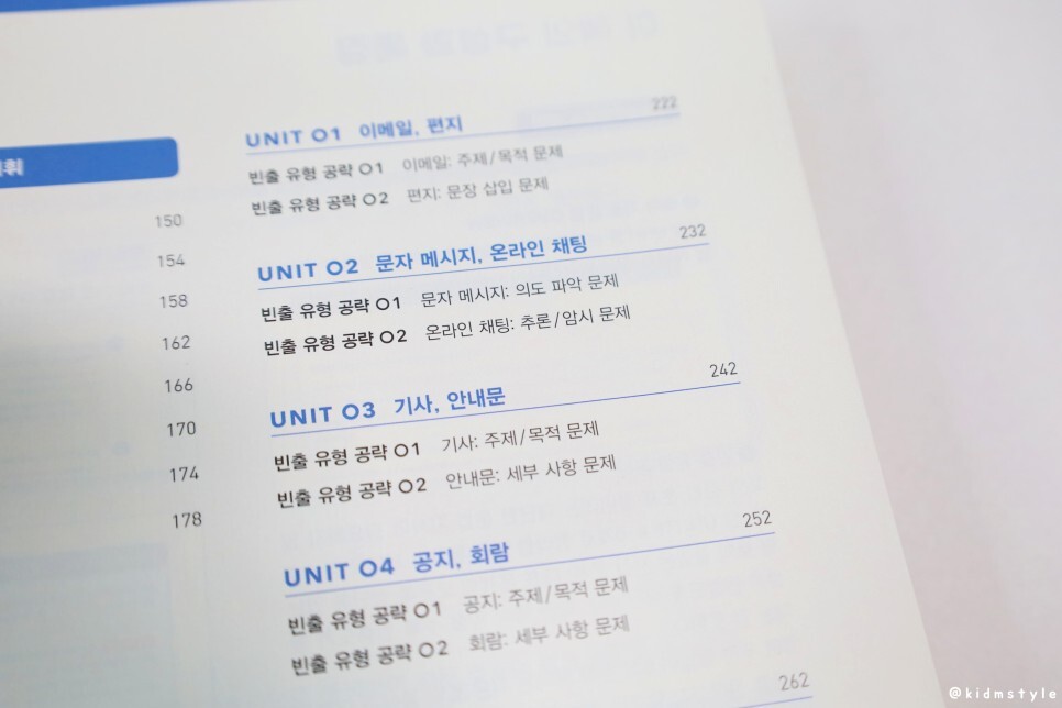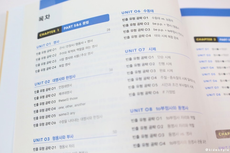 문법 위주인 파트 5, 6의 목차이다. 사람마다 다른데 토익 점수가 안 오르는 경우를 보면 문법을 잡지 못해서 헤매는 경우가 많다. 문법이 중요하다. 결국 영어는 문법이 시작이다. 회화도 결국 문법이다. 다양한 빈출 유형 공략을 공부하면서 실력을 키워나가보자.