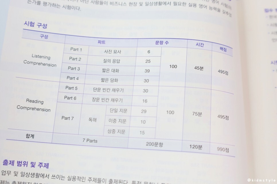 토익 시험의 구성이다. 2시간 동안 엉덩이 무겁게 앉아서 쳐야 하는 시험이다. 시간도 빠듯하다. 연습하고 요령을 익히면 적응된다.
