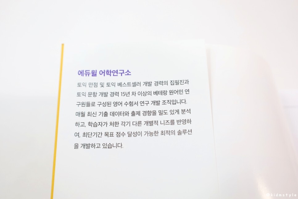 다양한 경력을 가진 집필진과 원어민 연구원들로 구성된 영어 수험서 연구 개발 조직인 에듀윌 어학연구소에서 만든 책이다. 최단기간 목표 점수 달성이 가능한 최적의 솔루션을 개발하고 있다고 한다. 토익은 길게 끌면 피곤하다. 짧게 집중해서 성과를 올리는 게 중요하다.