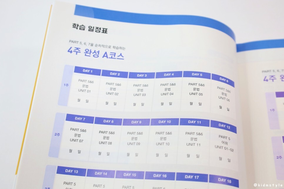 학습 일정표가 눈에 들어온다. 4주 완성으로 할 수 있다. 다른 것 하지 말고 토익만 한 달 딱 마음잡고 해보는 것을 추천한다. 이 책에서 알려주는 코스대로 말이다. 그 한 달은 하루에 10시간 이상 토익에 집중해 보라. 한 달 뒤에 성과가 엄청날 것이다.