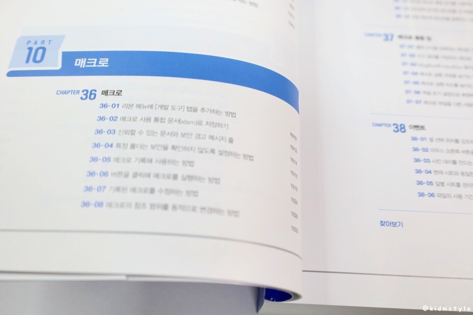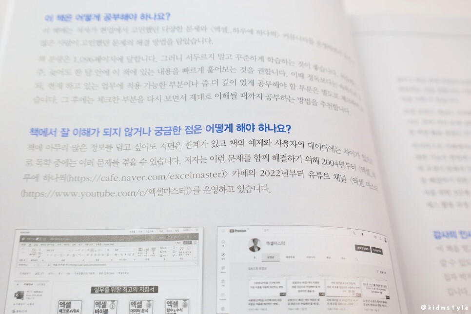 많이들 어려워하는 매크로 파트도 반가워서 찍어본다. 엑셀의 기초 기능부터 입력과 편집, 셀 서식, 표, 수식과 함수, 데이터 관리와 분석, 차트, 인쇄, 매크로 등 주요 엑셀 기능을 상세하게 수록해놓아서 실무에서 풀기 어려운 엑셀 문제를 쉽게 해결할 수 있도록 도와준다. 그래도 어려움을 느낀다면 네이버 카페나 유튜브 채널을 통해서 질문하여 도움을 받아 해결할 수 있는 것이다.