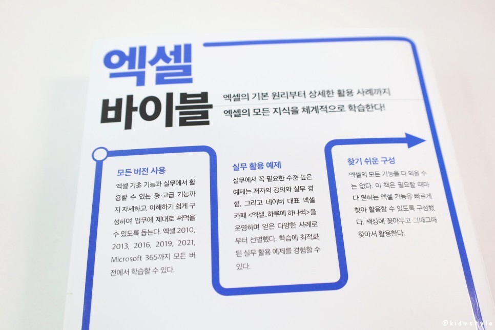 이 책의 장점은 모든 버전의 엑셀에서 사용 가능한 실무에 최적화된 엑셀 사용서라는 점이다. 아직도 현업에서는 2010 버전도 많이 쓰고 365나 2021버전도 쓰기 때문에 버전이 다양한데 사실 버전이 달라도 맥락은 거의 비슷하기 때문에 겁먹을 필요가 전혀 없다. 이 책에서도 그 맥락 위주로 설명하고 있기에 쉽게 익힐 수가 있다.