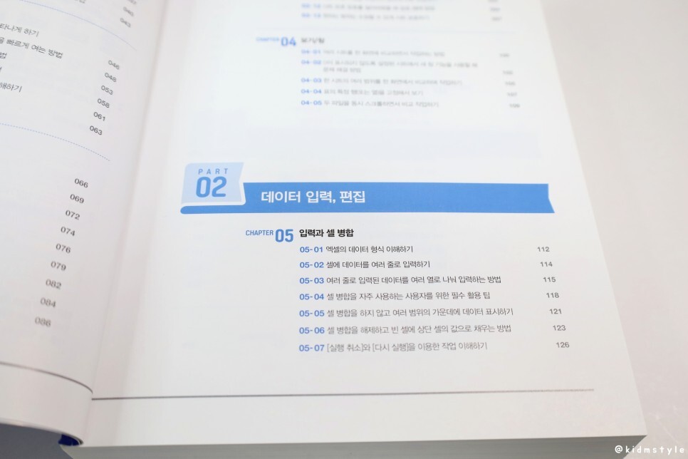각 파트 별로 나누어져 있고 그 파트 아래에는 챕터가 또 구분되어 있다. 목차가 잘 분리가 되어 있어서 찾기 쉽더라. 특히 업무 상황별로 적용할 수 있는 꼼꼼한 목차를 수록하여 실무 기능을 찾기 쉽게 표시해두었다.