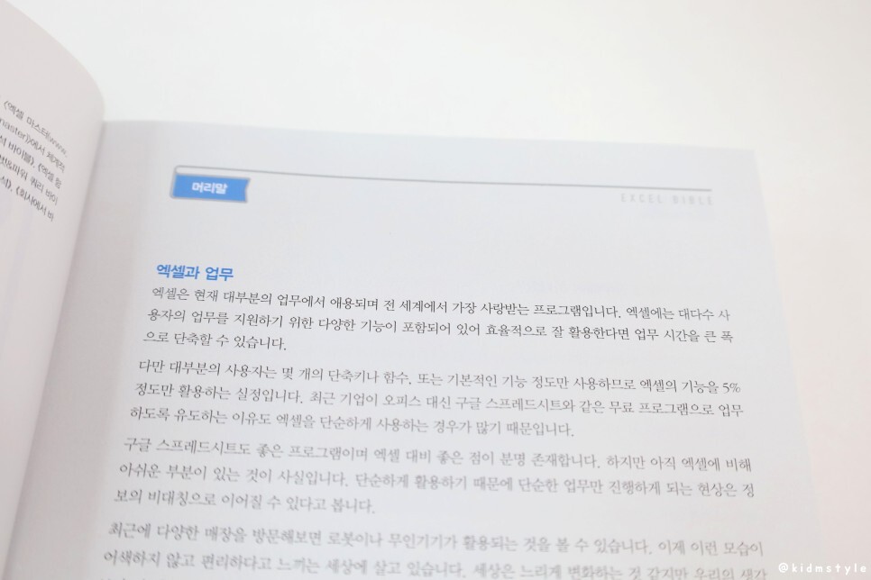 책의 두께는 상당히 두껍다. 책 쪽수는 무려 1096쪽에 달한다. 책장에 꽂아두고 엑셀의 주요 기능이 필요할 때 꺼내서 찾아보면서 익히면 되는 그런 책이다. 엑셀이라는 프로그램을 써보면서 이런 책이 하나쯤 있으면 좋겠다고 생각했는데 내 손에 이렇게 들어오니 참 기분이 좋다.