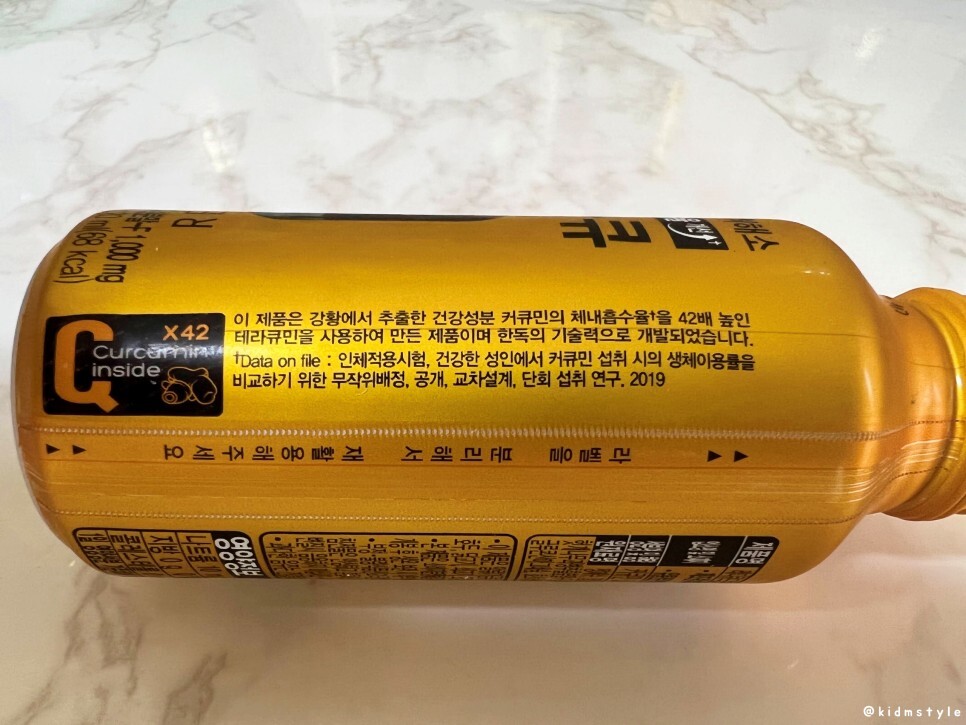 제품의 디자인이 전반적으로 노란색인 이유가 이 제품은 강황에서 추출한 건강 성분 커큐민의 체내 흡수율을 42배 높인 테라큐민을 사용하여 만든 제품이라 그런 것 같다. 강황 하면 카레, 카레 하면 노란색이니. 한독의 기술력으로 개발되었다니 기대가 된다.