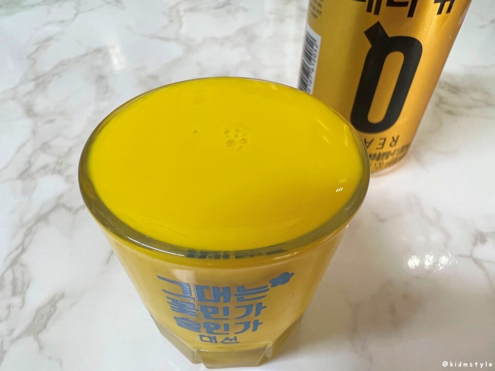 이 제품을 매번 그냥 말 그대로 숙취해소제로 맛보았기 때문에 색깔이 어떨지는 궁금하지도 않았고 생각도 안 했는데 리뷰를 위해서 소주잔에 따라보고 놀랐다. 오렌지주스 혹은 망고주스 같은 노란색이다.