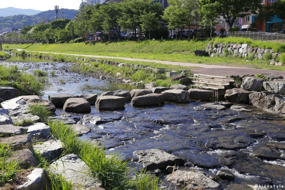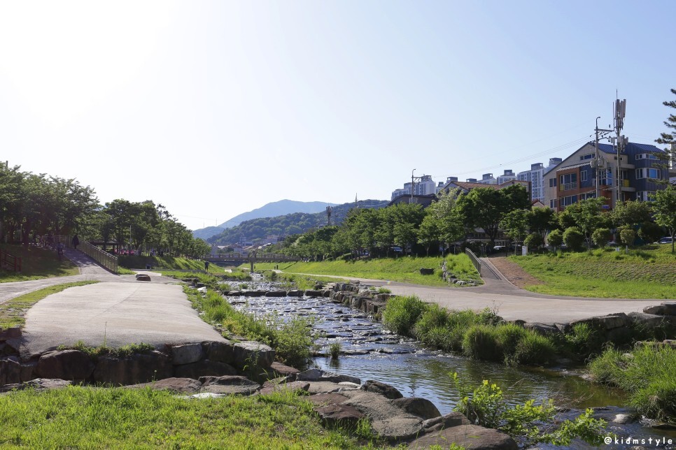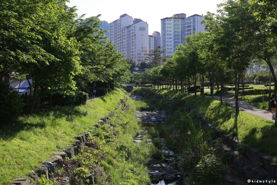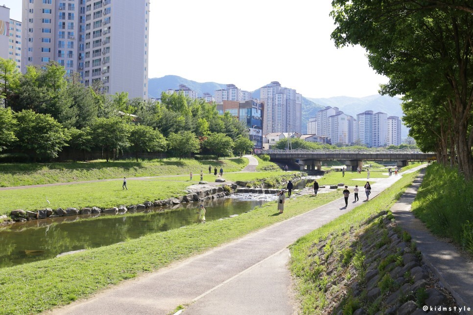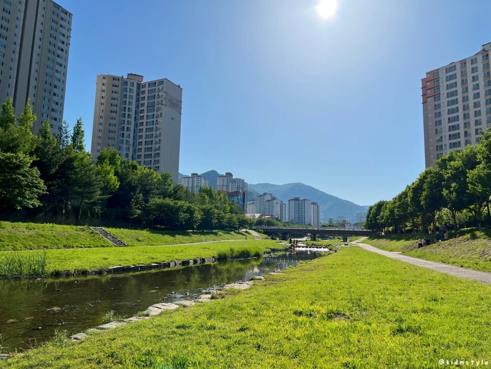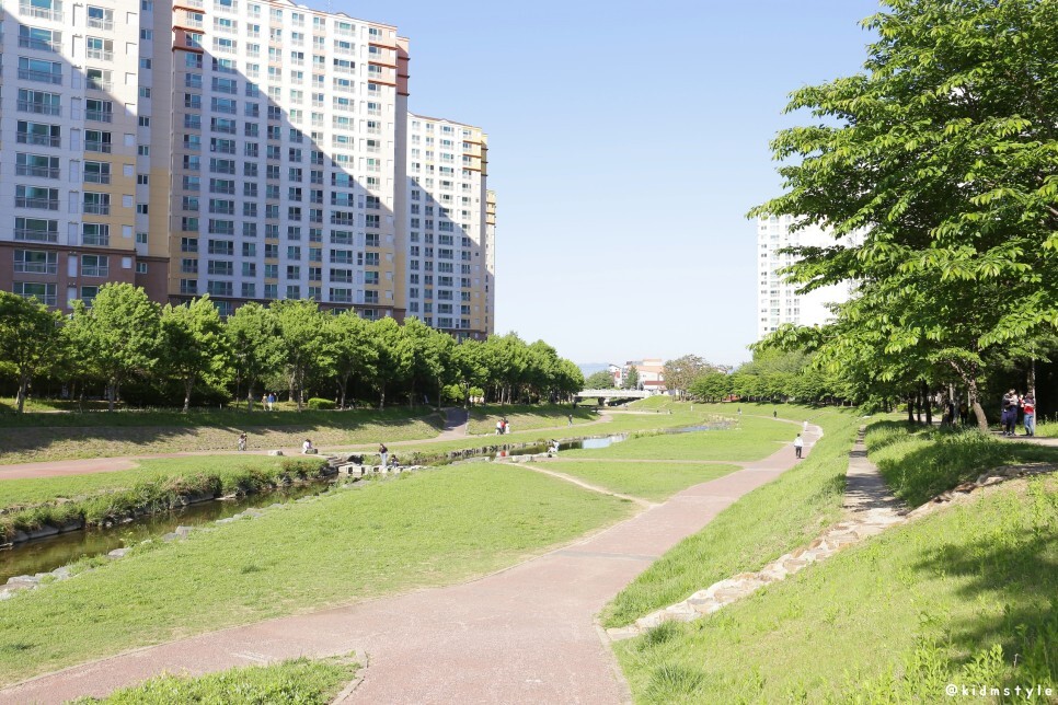 앞에 보이는 다리를 주 무대로 주말이나 행사가 있을 때 율하 카페거리 플리마켓이 열리곤 한다. 다리 밑에는 이른 여름을 즐기려는 아이들의 물놀이가 한창이다.