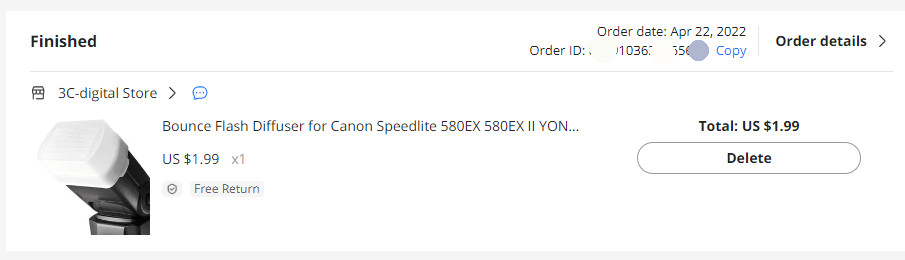 올해 초 다시 dslr을 구입하면서 캐논 580ex2 스트로브도 하나 구입했는데 옴니 바운스가 필요하더라. 그래서 알리익스프레스에 들어가서 찾아보았다. 판매하고 있더라. 역시 없는 게 없는 알리다. 1.99달러에 구입을 했고 얼마 걸리지 않아 배송을 받을 수 있었다.