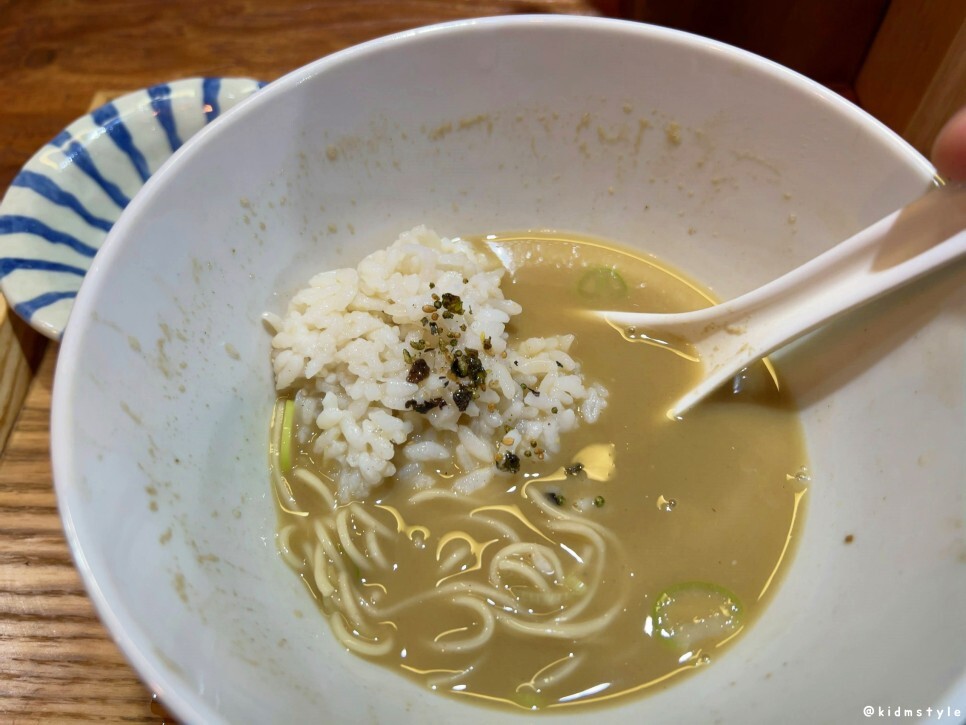 밥을 말아서 국물과 함께 맛본다. 장담하는데 이때까지 맛본 라멘에 밥 말아먹은 것 중에 가장 맛있다. 본인 입맛의 간이 아주 약하지 않은 보편적인 수준이며 라멘을 좋아한다면 한번 도전해 보는 것을 추천한다. 물론 시작은 맑은~ 라멘으로 말이다. 혹시 짠 음식에 대한 편견이 있다면 그래도 먹어보는 것을 추천한다. 그러면서 편견도 깨고 새로운 음식에 대해 눈도 뜨고 하지 않겠나 생각해 본다. 나 역시 그랬으니까. 이 한 숟가락이 정말 맛있더라.