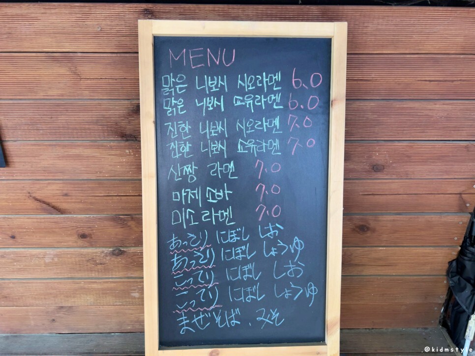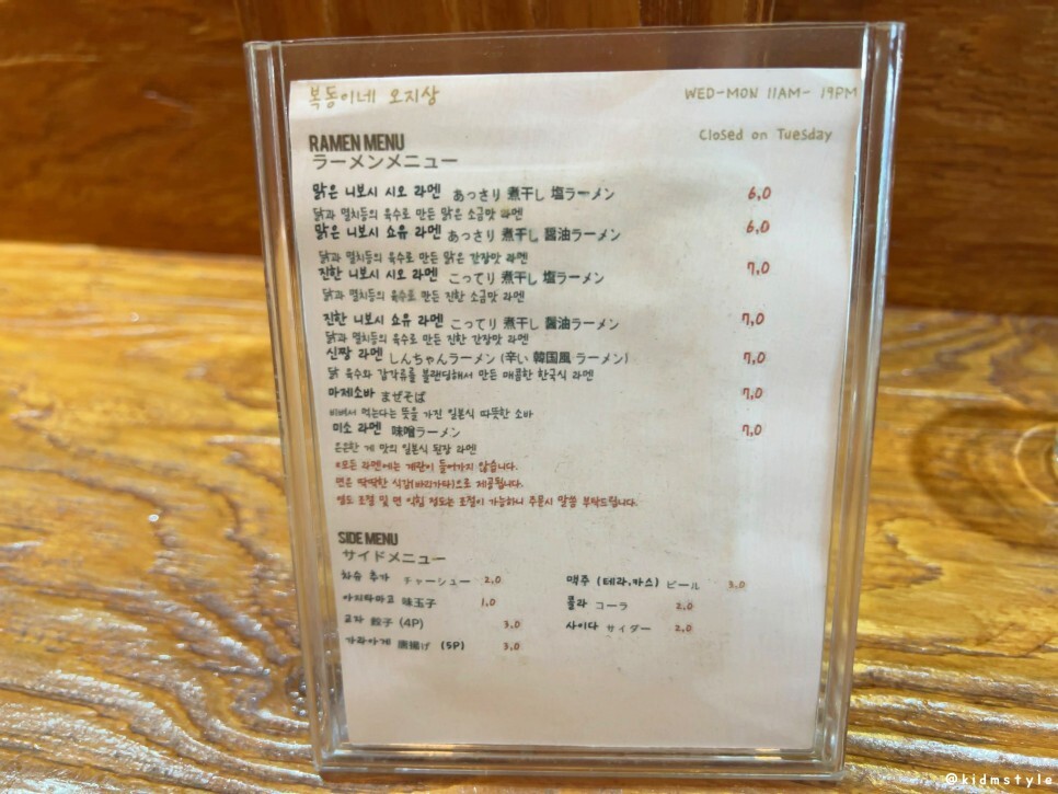 다양한 메뉴와 사이드 메뉴도 있는데 나는 진한 니보시 시오 라멘 (7,000원)과 아지타마고 (맛계란 1,000원)을 추가해서 주문해 본다. 진한 니보시 시오 라멘은 닭과 멸치 등의 육수로 만든 진한 소금맛 라멘인데 가기 전에 후기를 몇 개 찾아보니 라멘 초심자들보다는 라멘 마니아들에게 어울리는 메뉴라고 하더라.