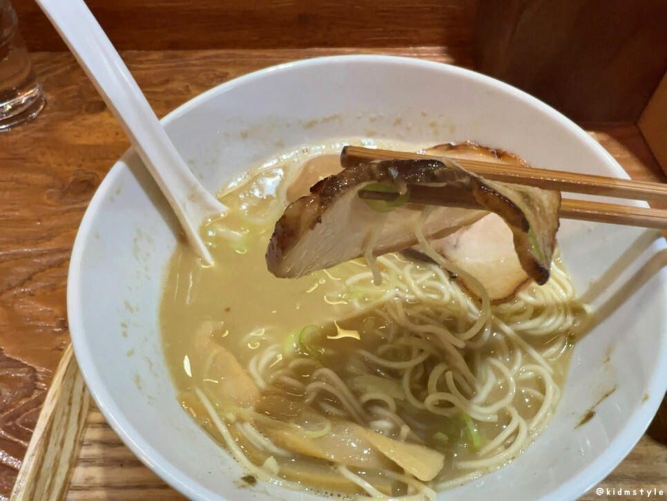차슈는 2조각 들어가 있는데 잡내도 없고 퍽퍽하지도 않은 딱 잘 만든 차슈이다. 가끔 어정쩡한 라멘집에서 차슈를 집어서 맛보았을 때 무슨 고무줄을 씹는 것 같은 느낌을 받을 때는 참 안타까울 때도 있는데 여기는 그렇지 않다. 재료 하나하나 신경을 많이 쓴 느낌이다. 자가제면이 아닌 기성품이라 하더라도 주방에서 어떤 방법으로 어떤 정성을 쏟아붓느냐에 따라서 결과물은 당연히 달라진다.
