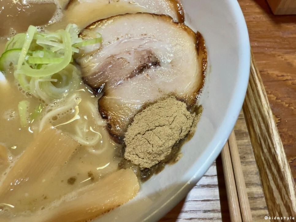 송송 썰어놓은 대파와 차슈, 그리고 가루가 보이는데 후추라고 생각할 수도 있으나 후추가 아니고 멸치 등을 곱게 갈아놓은 생선가루인데 안 그래도 진한 육수를 더 진하게 만들어주는 마법 같은 가루이다.