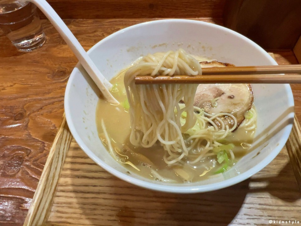 면은 보다시피 얇은 면이다. 나는 개인적으로 이런 면이 좋더라. 돈코츠라멘을 즐기다 보니 더 그렇다. 얇은 면은 국물이 잘 스며드니 면과 스프의 조화를 확실하게 해준다. 그래서 이런 면이 인기가 있는 것 같기도 하다.
