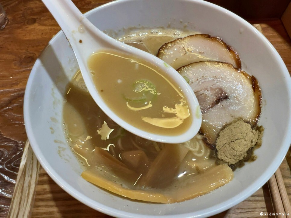시오라멘은 이름답게 짠맛이 강한 편이다. 거기에다 진한 니보시 시오 라멘이니 얼마나 짤까? 막상 국물을 떠먹어보면 짜다는 생각보다는 진하다는 생각이 먼저 든다. 숟가락 위에 얕게 국물을 떠보아도 속이 비치지 않는 국물은 정말 진한 육수와 정성이 들어간 국물임이 틀림없다. 물론 짜기도 짜다.