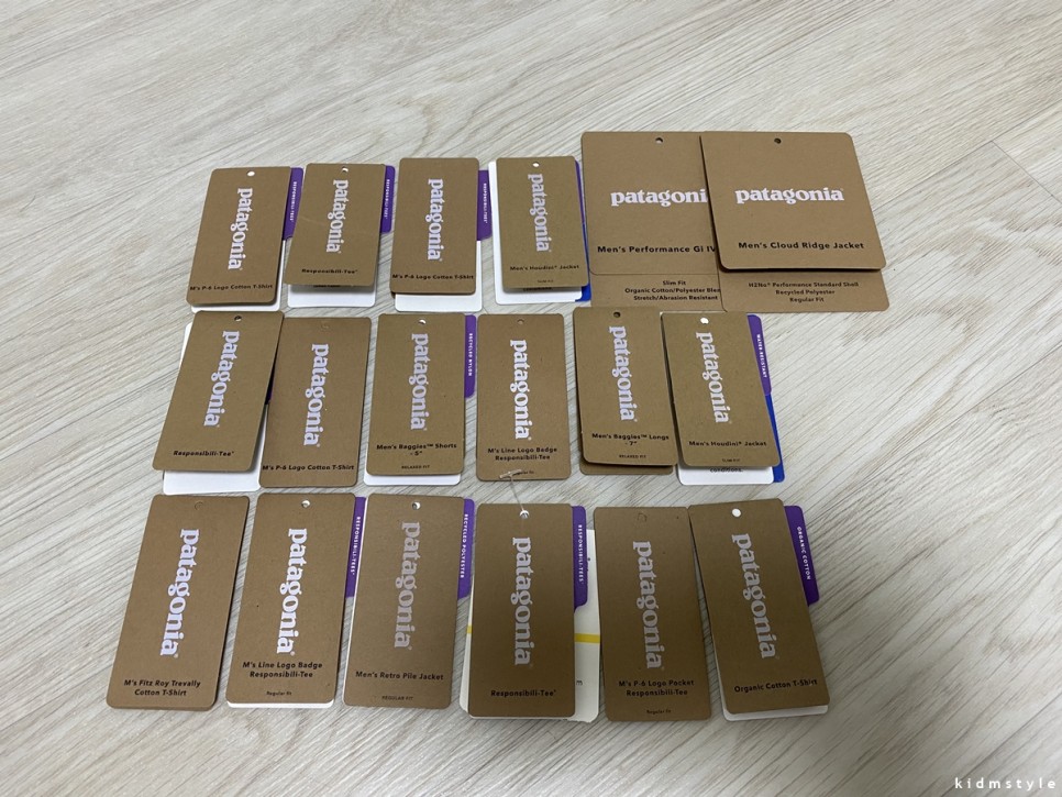 이것도 당시에 찍어놨던 택의 일부, 현재는 1.5배 정도 늘었다고 보면 된다. 이렇듯 한 브랜드가 괜찮으면 계속 구입하는 버릇이 있는데 가지고 있는 파타고니아 제품은 대부분 면 소재라 기능성 소재를 찾을 수밖에 없었다.