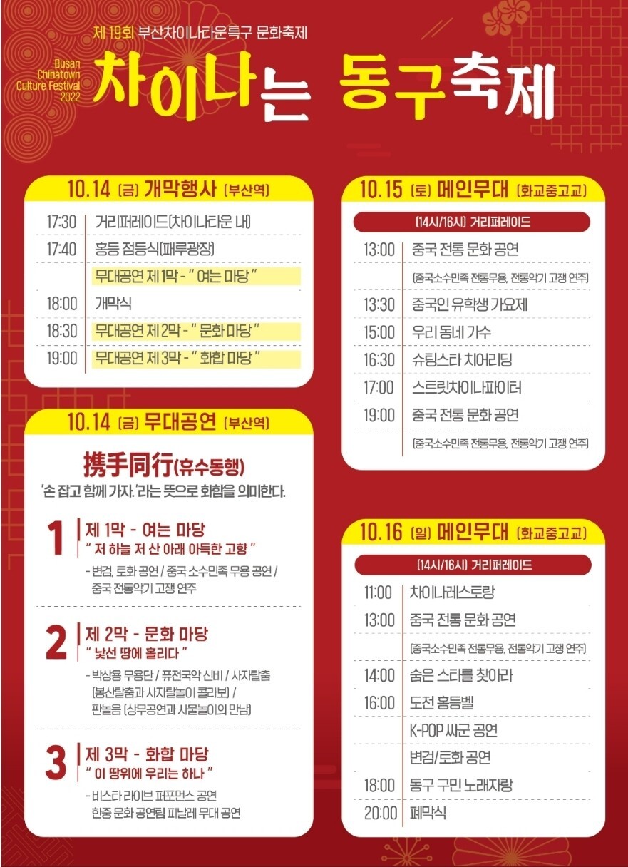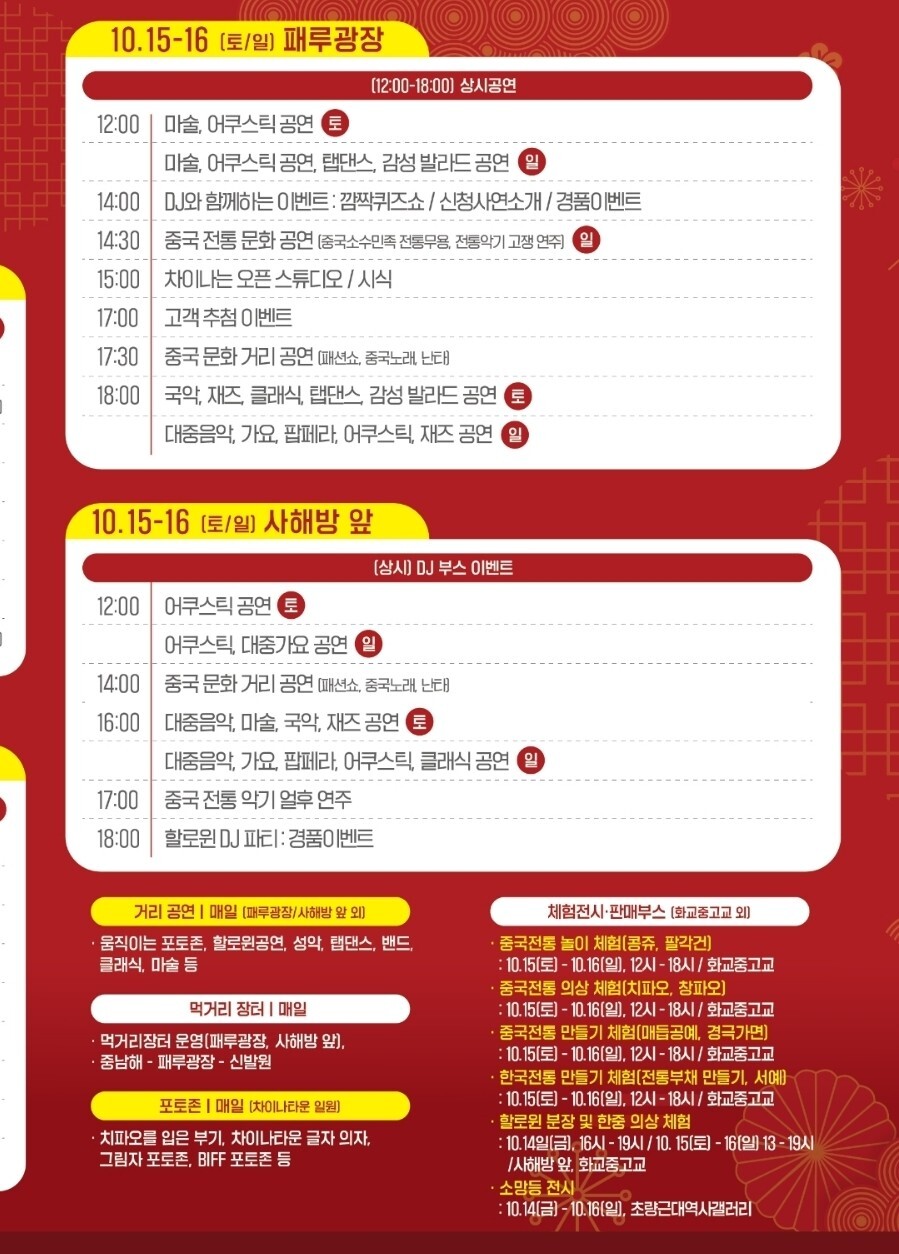 올해 펼쳐진 제19회 부산차이나타운특구 문화축제, 차이나는 동구축제는 매우 성공적으로 잘 마무리된 것 같습니다. 주변에서도 재미있었다고 다들 이야기하더군요. 매년 개최되는 축제이니 올해 구경하지 못한 분들은 내년 축제를 기대해 보시기 바랍니다. 참 재미있습니다. 아래에 올해 축제의 일정을 올려봅니다. 참고하시기 바라며 내년 축제를 기약하며 글을 마무리합니다.