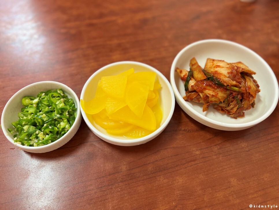 김치는 먹을 만큼만 담아서 맛보고 남기면 안 된다. 흔한 중국산 김치와 다르다. 정성이 들어간 핸드메이드 김치이다. 땡초와 단무지도 나오는데 이날은 땡초가 그리 맵지 않더라.