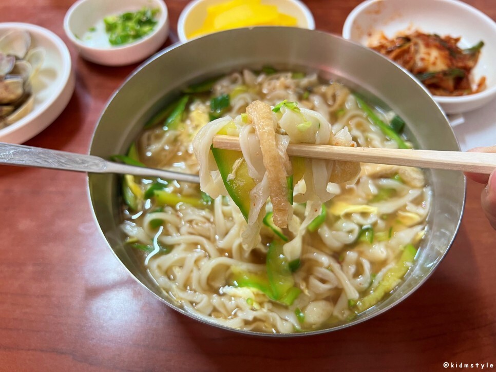 흔히 말하는 손칼국수이다. 자가제면이라 면발은 굵은 편이며 조금 투박하다. 먹는 날에 따라 면발이 조금 아쉬울 때도 있으니 오늘은 면발도 참 괜찮다.