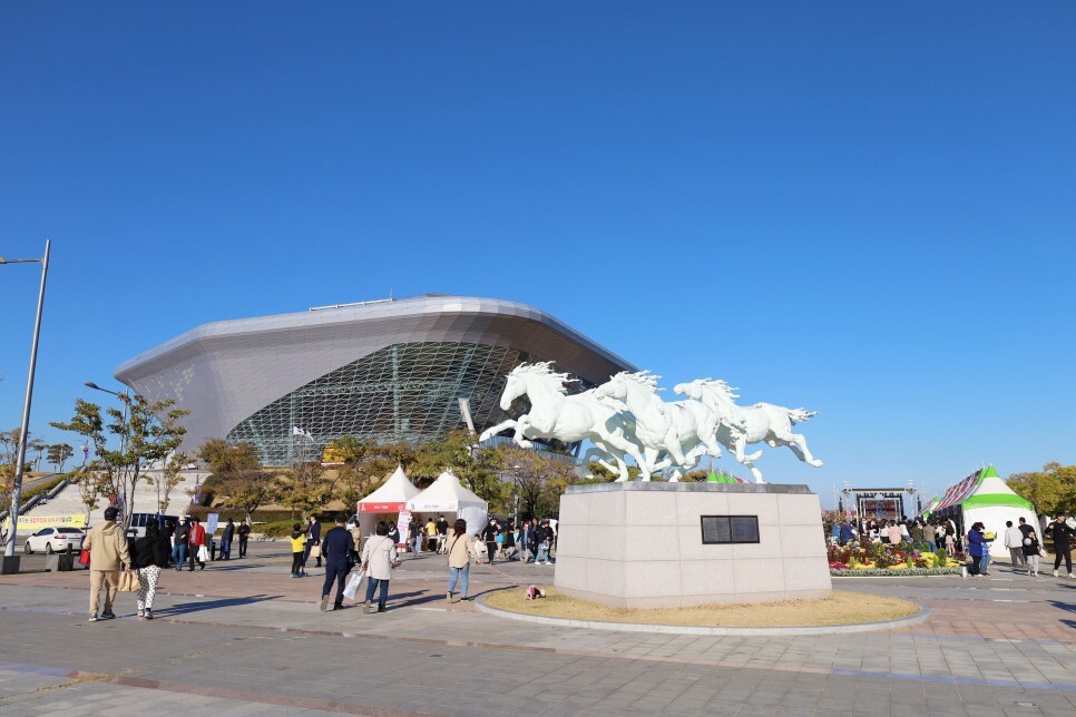 국립해양박물관을 배경으로 한 절영마 동상이 참 멋져 보입니다. 마치 당장이라도 달려나갈 듯한데요. 그 뒤쪽으로 스페셜티 커피 존이 우리를 기다리고 있습니다.