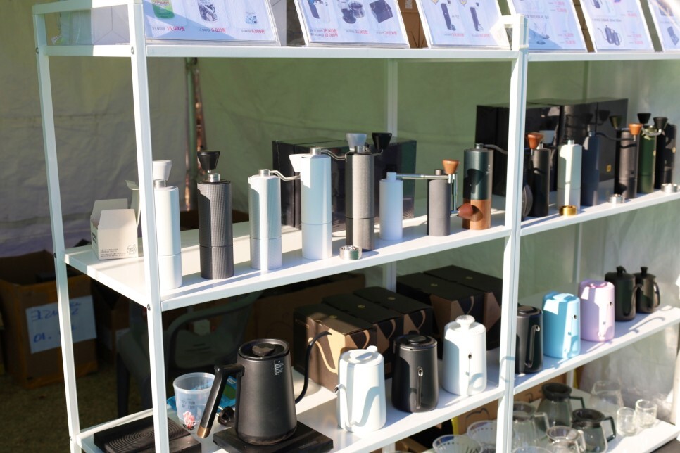 핸드드립을 위한 그라인더, 서버, 드리퍼, 주전자 등 다양한 장비들도 눈에 들어옵니다. 저도 커피에 빠져서 커피 공부도 꽤 오래 하고 다양한 핸드드립 장비와 커피 머신을 가지고 있는데요. 관심이 많은 분야라서 그런지 오늘 행사가 너무 즐겁습니다.