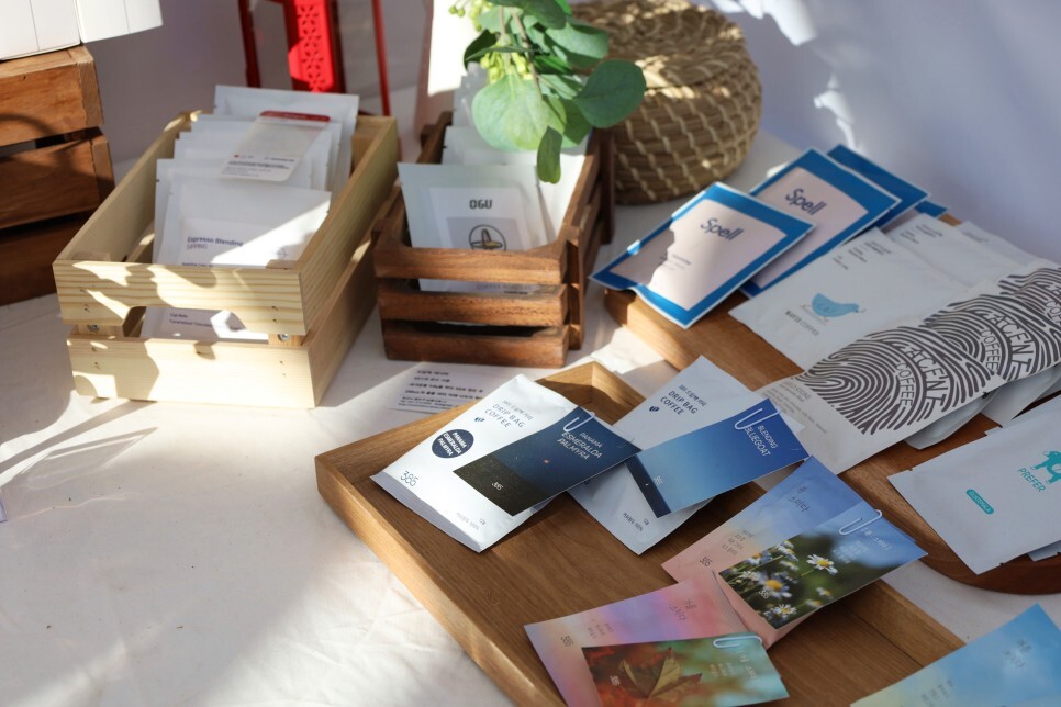 전시 휴게존에서는 커피 도구와 다양한 드립백을 구경할 수 있었는데요. 오구 카페, 카페 385 등 영도의 유명 카페의 드립백이 눈에 들어와 반갑더군요.