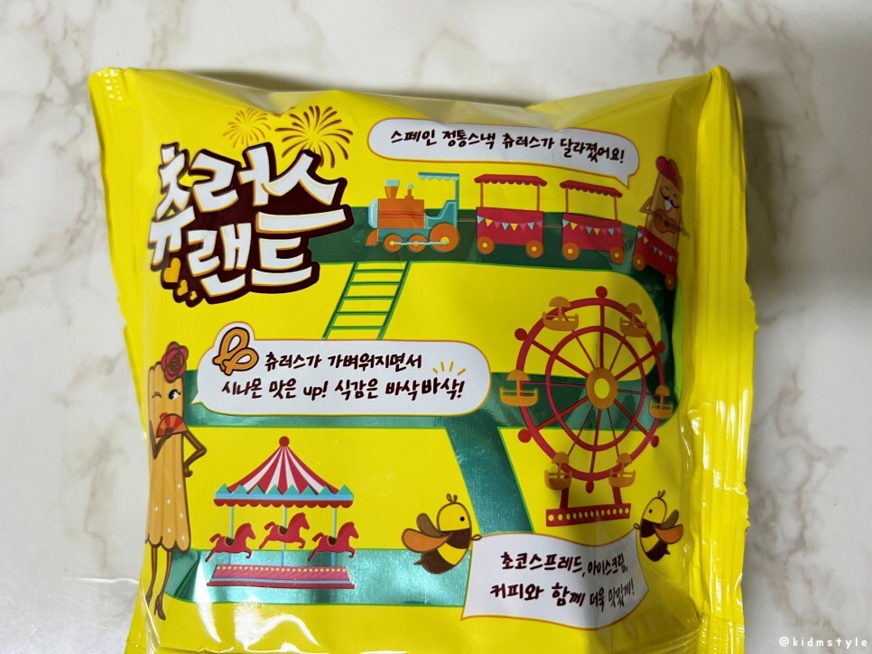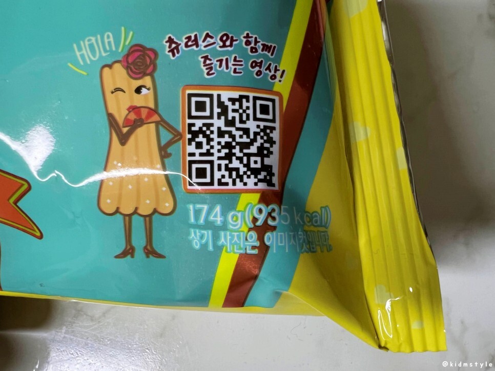 봉지 뒷면을 보니 츄러스랜드라고 귀엽게 캐릭터가 그려져 있다. 어떤 맛일지 궁금하다.