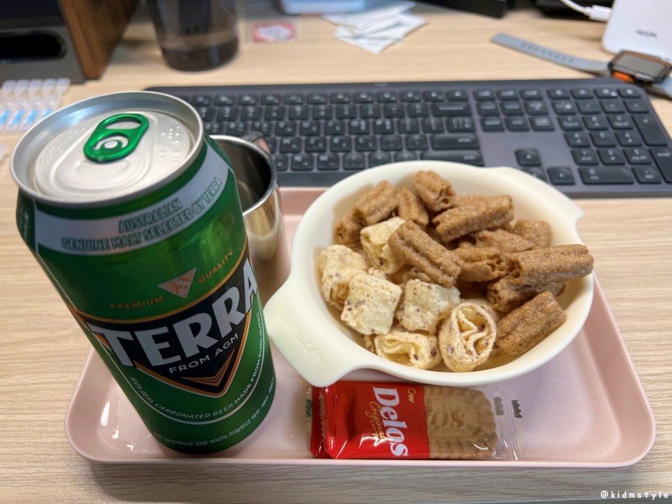 맥주를 가져와서 안주로 맛보았다. 오리온 꼬북칩 스윗 바닐라 맛,, 청우 델로스도 함께 맛보았다. 안주로도 참 괜찮다.